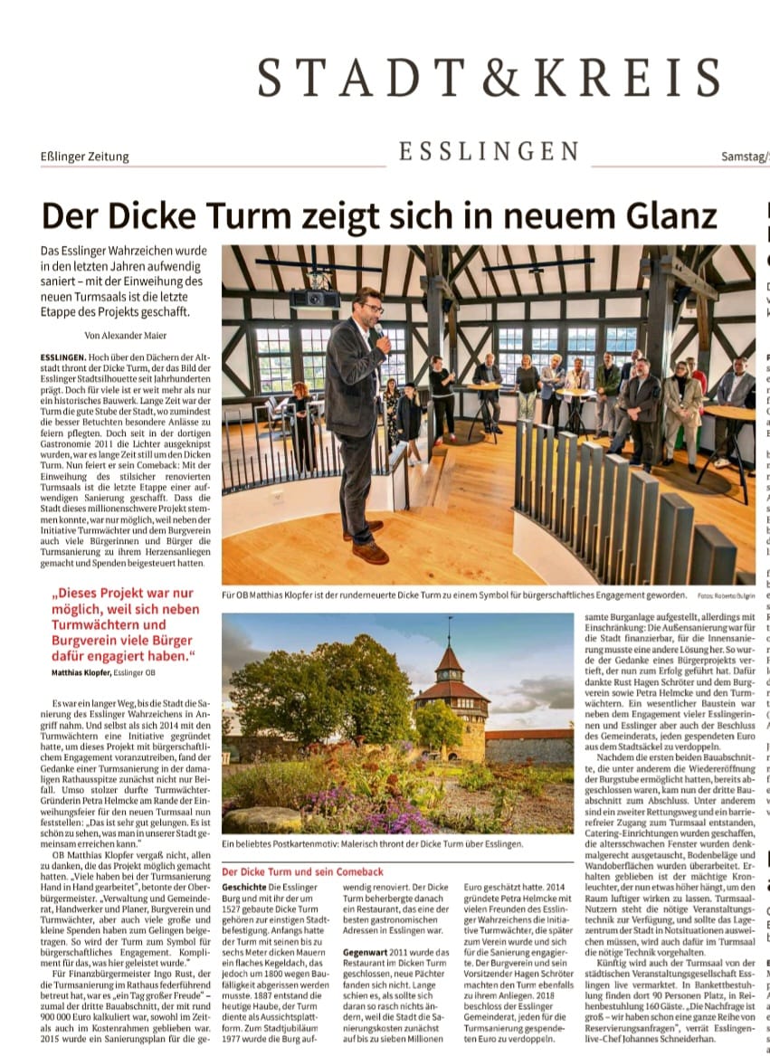 ESSLINGEN. Hoch über den Dächern der Altstadt thront der Dicke Turm, der das Bild der Esslinger Stadtsilhouette seit Jahrhunderten prägt. Doch für viel ist er weit mehr als nur ein historisches Bauwerk. Lange Zeit war der Turm die gute Stube der Stadt, wo zumindest die besser Betuchten besondere Anlässe zu feiern pflegten. Doch seit in der dortigen Gastronomie 2011 die Lichter ausgeknipst wurden, war es lange Zeit still um den Dicken Turm. Nun feiert er sein Comeback: Mit der Einweihung des stilsicher renovierten Turmsaals ist die letzte Etappe einer aufwendigen Sanierung geschafft. Dass die Stadt dieses millionenschwere Projekt stemmen konnte, war nur möglich, weil neben der Initiative Turmwächter und dem Burgverein auch viele Bürgerinnen und Bürger die Turmsanierung zu ihrem Herzensanliegen gemacht und Spenden beigesteuert hatten.